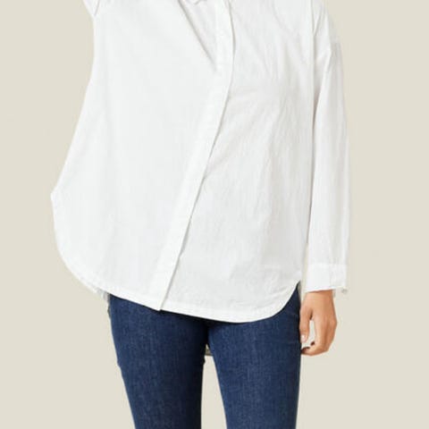 Klassisk hvid skjorte i let krøllet bomuld med gennemgående knaplukning. Skjorten har et løst og flot snit, der falder smukt ned over figuren. Den er afrundet forneden med slidser i siderne, hvilket giver et stilrent og moderne look.