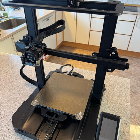 Creality Ender-3 V2 3D-printer i sort. Printeren har en byggevolumen på 220 x 220 x 250 mm og anvendes til fremstilling af tredimensionelle objekter ved hjælp af smeltet filament.