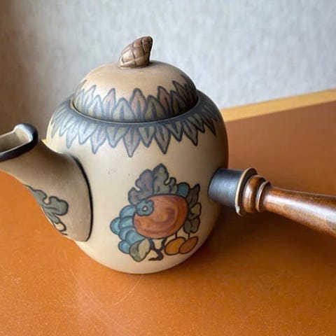 Har nogle- tror jeg det er, brændings /glasur fejl 1 på låget- der hvor låget sidder fast, samt lidt på undersiden af tuden. Det virker ikke som afslag.