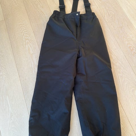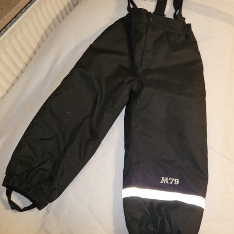 Sorte skibukser i str. 152 fra M79. Der er aftagelige seler. Refleksstribe på det ene bukseben. Lukkes med en knap og velcro. Elastik i taljen og ved anklerne. Der er knapper i bukserne til at sætte en elastik fast i til at sætte rundt om støvlerne. Har desværre kun en enkelt elastik.