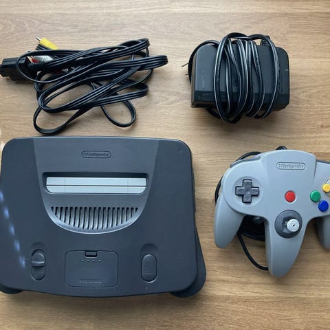 Nintendo 64 spillekonsol med tilhørende spil og tilbehør. Inkluderer flere spil i kassetter samt tre controllere i forskellige farver. Konsollen er af ældre model til Nintendo 64 platformen.