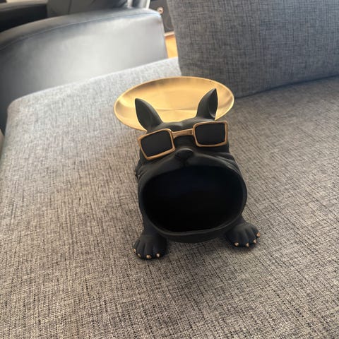 Bulldog-opbevaringsskulptur, cool hundeskulptur, stor mund, bulldog-nøgleholderfigur med opbevaringsbakke, dekoration til skrivebordet, sort