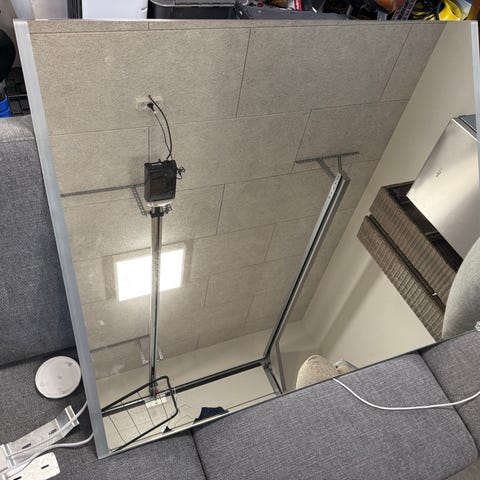 Firkantet flot spejl med lysfelt du kan justere, tænde og slukke via 3 touch-knapper som er indbygget i spejlet. Du kan justere lysfarven fra varm til kold, samt regulere lysstyrken.