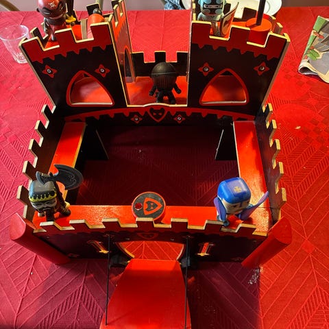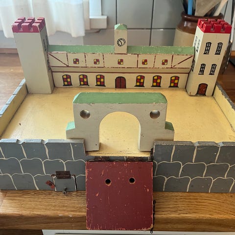 Middelalderborg legetøj i i træ og i flere dele med tårn, porte og bevægelige dele. Farverne er primært grå og grønne med detaljer i brunt og sort. Egnet til børns leg og samling.