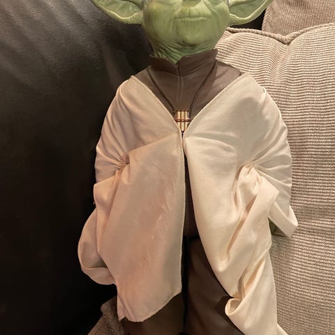 Star Wars Baby Yoda med detaljeret beklædning og sort base med Star Wars-logo.