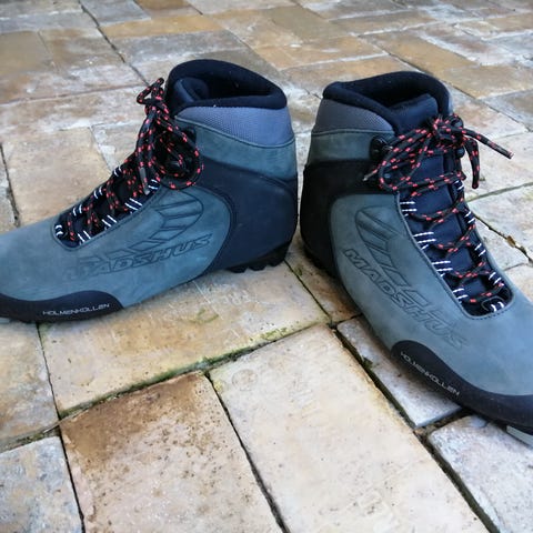 Madshus Holmenkollen skistøvler str. 43 (EUR), grå. Med snørrebånd, sorte med rødt mønster.
