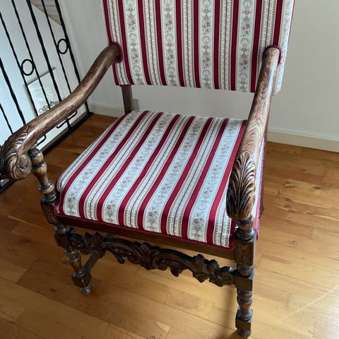 Dette er en antik Thebes-stil skammel i hårdttræ med et flettet sæde, der minder om dem, der tilskrives Liberty & Co. Skamlen har snoede balusterben og tværstivere, og dens form er inspireret af egyptisk genoplivelsesdesign fra 1800-tallet, baseret på arkæologiske fund. Den kan være lavet af mahogni.