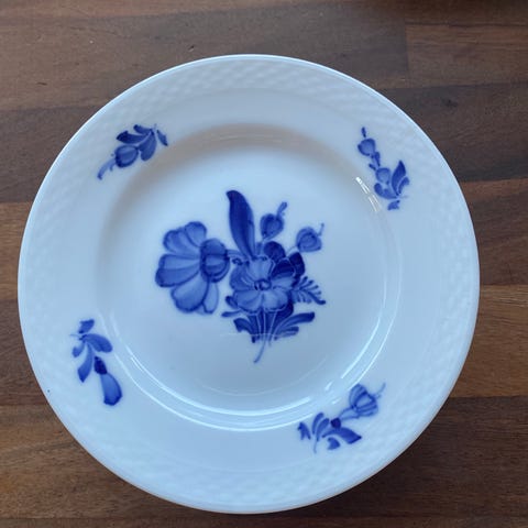 Royal Copenhagen tallerken med blå blomsterdekor. Tallerkenen har en hvid glasur med blå blomsterdetaljer og er lavet af porcelæn.