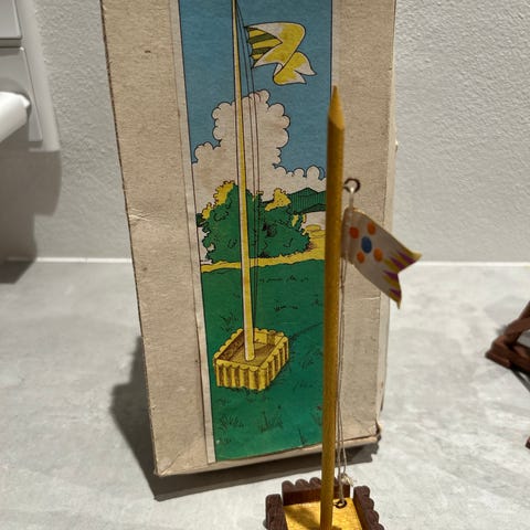 Sæt af trædekorationer bestående af en brønd med snor og spand, et vandtårn med stige, et skilt med teksten 'Oklahoma' og en rektangulær ramme. Dekorationerne er udført i træ med forskellige farver og detaljer.