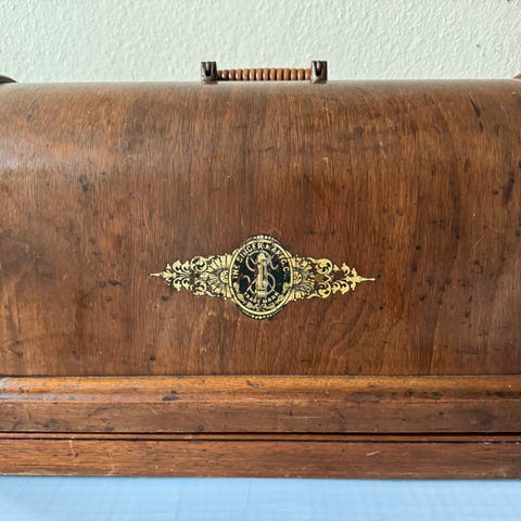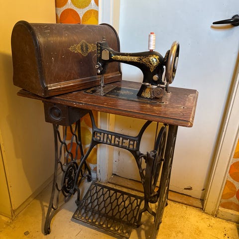 Singer S14-1956 symaskine med fodpedal, monteret på et gammelt træbord. Maskinen er sort med gulddekorationer og har en metalplade med serienummer. Bordet har en træplade og et metalstel med fodpedal til manuel betjening. Maskinen leveres med et beskyttelsesdæksel i træ.