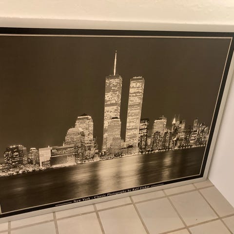 Sort/hvid fotografi af New Yorks skyline med Twin Towers. Billedet viser byens skyline med høje bygninger og er i et klassisk fotografisk udtryk.