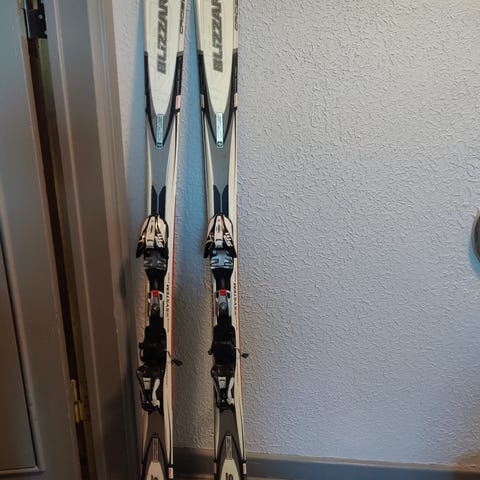 Crystal 158 ski med bindinger og stave. Skiens længde er 158 cm. Farven er primært hvid med sort mønster. Sættet inkluderer to sorte stave. De har været brugt 4 dage.
