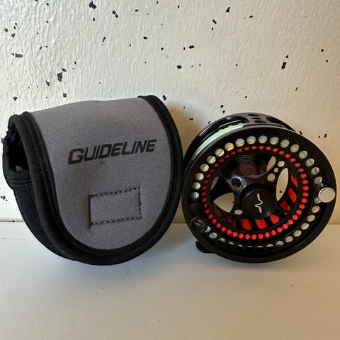 Scierra fluehjul med line i metal og neonfarvet line. Hjulet er designet til fluefiskeri og leveres med tilhørende opbevaringspose i sort stof med rødt logo.