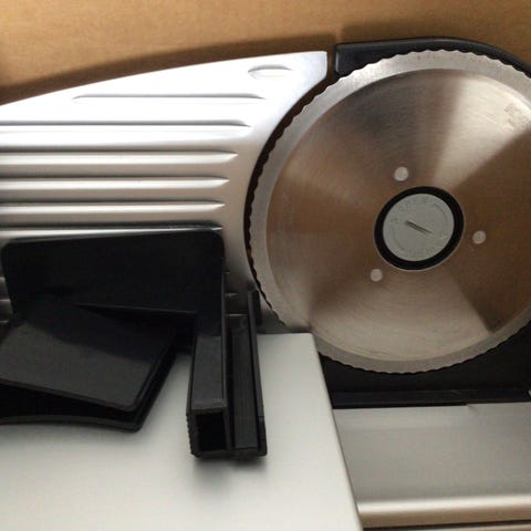Magimix køkkenmaskine med forskelligt tilbehør til madlavning og forberedelse. Inkluderer skiver, rivejern, citruspresser og diverse beholdere i sort og transparent materiale. Købt i januar 2022.