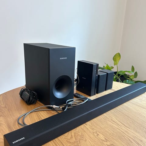 Samsung HW-P550 soundbar med tilhørende subwoofer. Produktet er designet til at forbedre lydoplevelsen ved brug med tv eller andre lydkilder. Farve og materiale er sort.