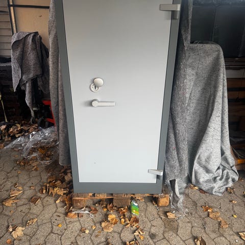 Vi har 2 stk solide metalskabe med dobbelt låger. Skabene har vi fået specialbygget. Der er 4 hylder til hver, og de kan placeres som man vil. Hver hylde kan klare en ret stor vægt. Der er Ruko låse i lågerne, og desværre kun 2 nøgler til det ene skab. Det skulle være muligt at få lavet nye nøgler da det er et kendt system.