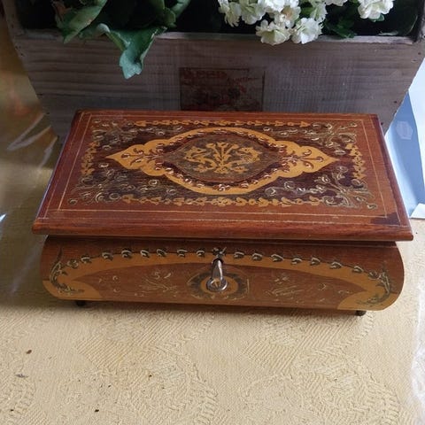 Smukt skrin med orientalske indlæg i kassen. Bredde 18 cm højde 14 cm dybde 12 cm..