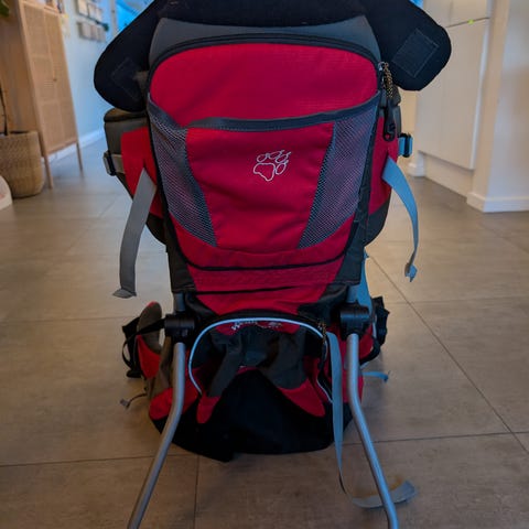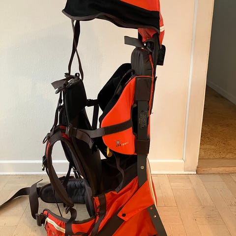 Lækker bærestol med mange fine detaljer. En ødelagt strop som vi ikke har fået fikset, kan helt sikkert laves. Derfor kan pris.