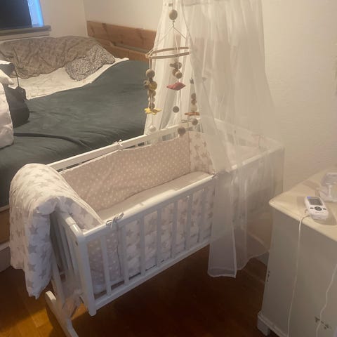 Madras og hjemmelavet sengerand medfølger.