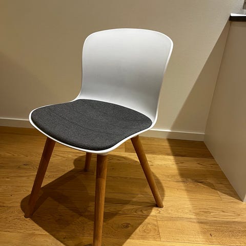 6 stk spisebordstole fra Myhome med grå stof og egetræsben. Siddehøjde 48 cm.