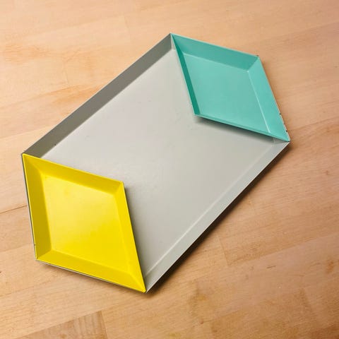 Hay bakke i grå farve. Bakken har en sekskantet form og kan bruges til servering eller opbevaring.