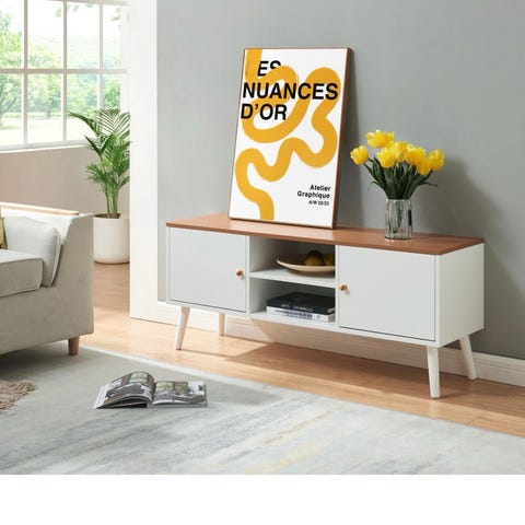 Flot og stilrent TV-bord fra JYSK i lyst egetræslook med flet-/rattanlåger.