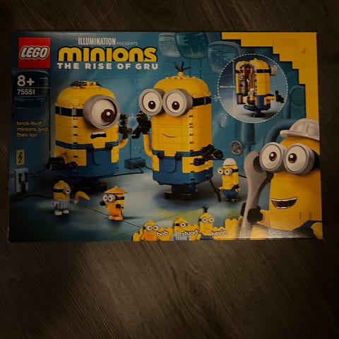 LEGO Minions 75582 bygge- og displaymodel med figurer af Minions og en central figur i sort tøj. Sættet er egnet til børn fra 9 år og op. Modellen kan bruges til leg og som samlerobjekt.