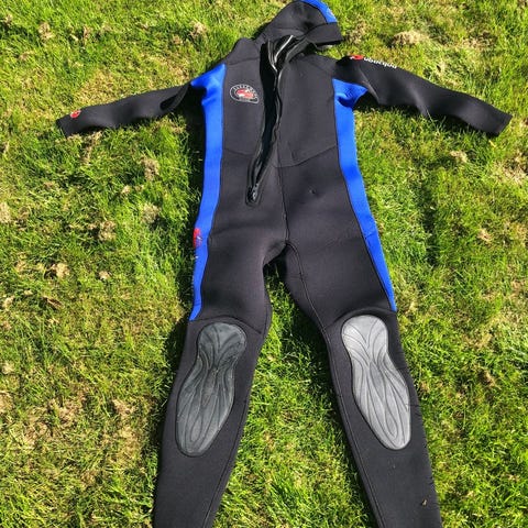 Seac Sub våddragt i rød og sort farve, egnet til dykning. Medfølgende Seac Sub dykkervest med integreret regulator og slanger. Oppustelig bøje i orange farve til sikkerhed under dykning.