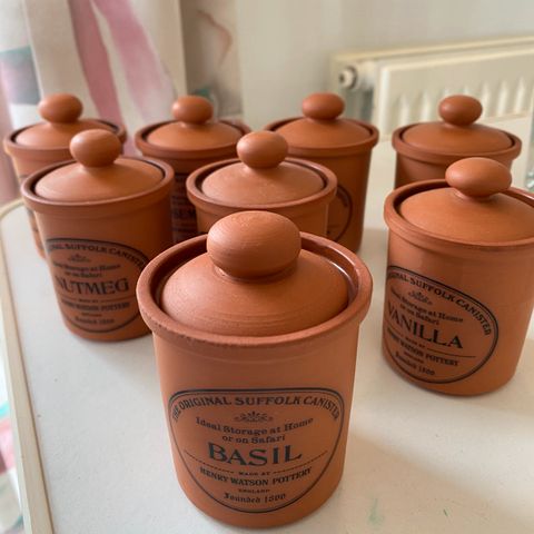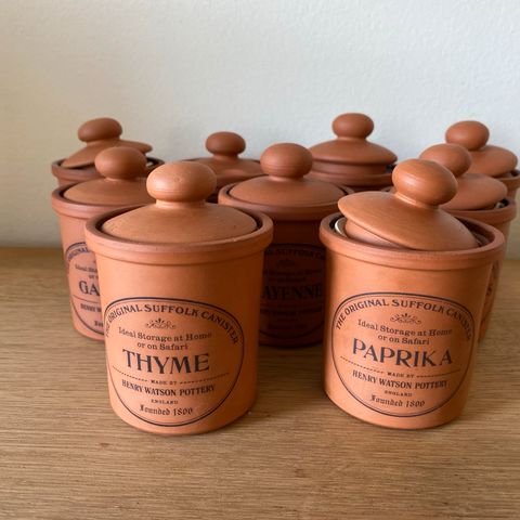 Diverse krydderikrukker fra Henry Watson. Indeholder ca 1 dl. De fleste låg og krukker er uden skår, se evt billed.