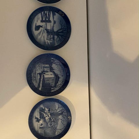 Royal Copenhagen Juleplatte fra 1997 og 1998 i porcelæn med blå og hvide motiver. Platterne viser traditionelle julemotiver og er dekoreret med detaljerede illustrationer. De er designet til samling og dekoration i hjemmet i juletiden.