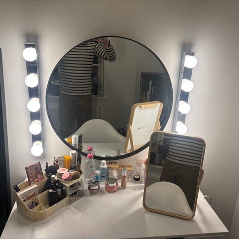 Bordspejl med tre foldbare spejle og indbyggede LED-lys langs kanten af det centrale spejl. Spejlet er monteret på en rund base og kan justeres i vinkel. Designet til brug ved bord eller kommode, egnet til makeup og personlig pleje.