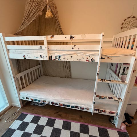 Flexa køjeseng til børn med meget tilbehør. Sengen er udført i træ med en hvid finish. Den har en øvre og en nedre soveplads, egnet til børn.