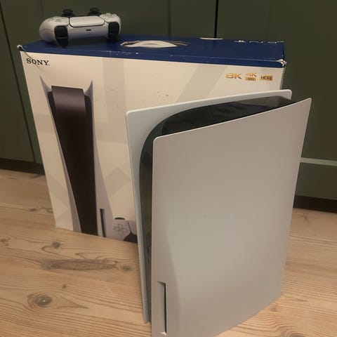 Sony Playstation 5 spillekonsol med tilhørende controller og strømforsyningskabel. Konsollen har et karakteristisk hvidt og sort design.