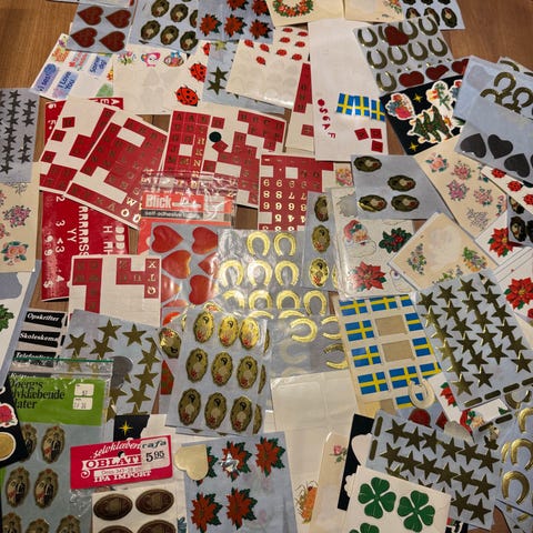 Uåbnede pakninger med mere end 100 etiketter - 24 firkantede og 84 ovale.