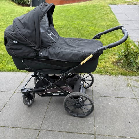 Der kan medfølge originalt regnslag, madras og sele.