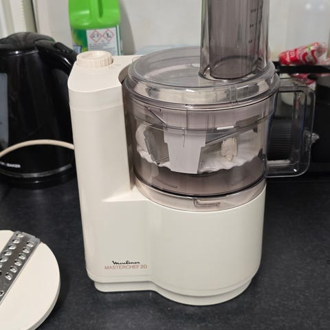 Moulinex Masterchef 20 foodprocessor i hvid med flere tilbehørsdele til forskellige madlavningsopgaver. Inkluderer skiver og rivejern samt andre tilbehørsdele til alsidig brug i køkkenet.