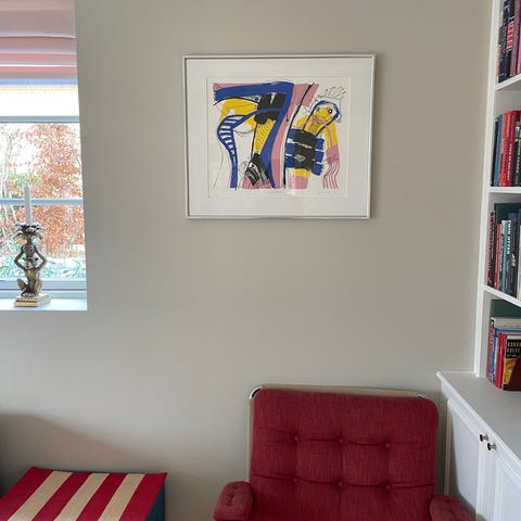 Lis Zwick litografi med titlen 'Dario fo Trater'. Nummereret 171/200 og dateret 1986. Litografiet er indrammet og indeholder farverige, abstrakte elementer. Den har desværre hængt op af en fugtig væg hvorfor bagsiden har taget skade. Byd gerne (oprindelig pris var 3000 kr)