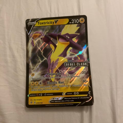 Pokémon Toxtricity V samlekort fra Sword & Shield Rebel Clash serien. Kortet viser Toxtricity med angrebene Poison Jab og Electric Riot, og har en energiværdi på 210.