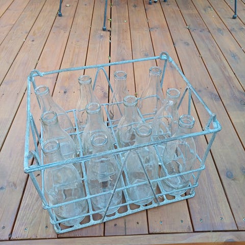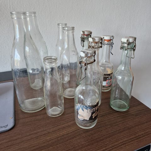 Fem stk. dekorative gamle flasker, bl.a. gamle mælkeflasker. Sælges samlet for 30 kr.