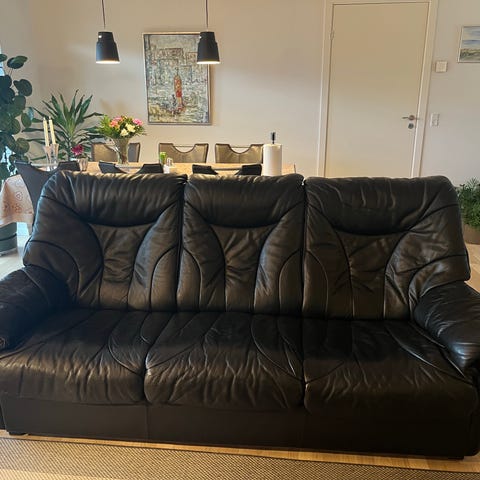 Sælger en rummelig og komfortabel brun lædersofa. Sofaen er brugt og har almindelige brugsspor/patina, som ses på læderet, men den er stadig fuldt funktionel og behagelig at sidde i. Perfekt til stuen, sommerhuset eller teenageværelset.
