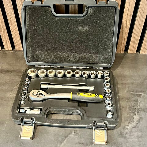 Sæt bestående af forskellige værktøjer inklusive en elektrisk skraldenøgle, et udvalg af topnøgler i forskellige størrelser, samt en række skruenøgler i forskellige størrelser. Værktøjerne leveres i forskellige opbevaringsløsninger såsom kasser og rullepunge. Materialer og farver varierer mellem værktøjerne. Sættene er velegnede til diverse mekaniske og reparationsopgaver.