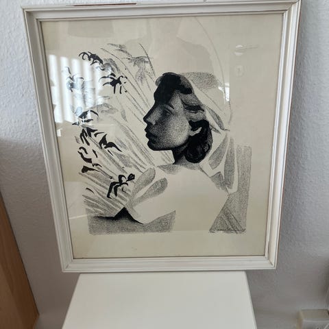Sikker Hansen dame i marken, er også brugt som reklame for Randers høstbindegran. Rammemål: 60 x 67. Enten smule gullig pga alder ingen vand. Rammen har nogle afskalninger af malingen.