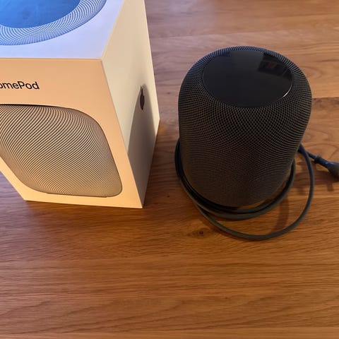 Apple HomePod mini smart højttaler i sort. En kompakt højttaler designet til at levere lyd i høj kvalitet med trådløs tilslutning. Velegnet til brug i hjemmet til musikafspilning og stemmeassistenter.