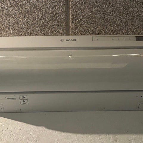 Bosch styring til varmepumpe med digitalt display og kontrolknap. Enheden har indikatorlamper og er beregnet til styring af varmepumpesystemer.
