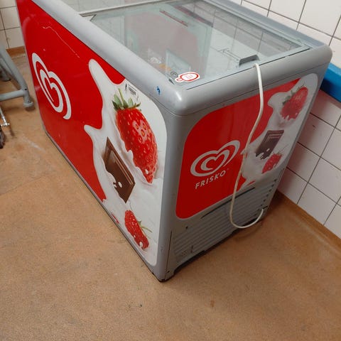 Is kummefryser med glaslåger til opbevaring og visning af is på frost.