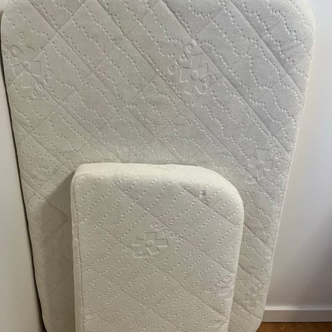 Let brugt madras med forlænger, til sebra seng / LillePer seng. Købt hos Skumhuset.