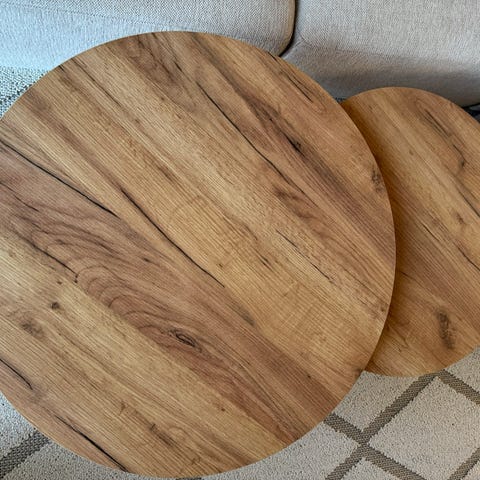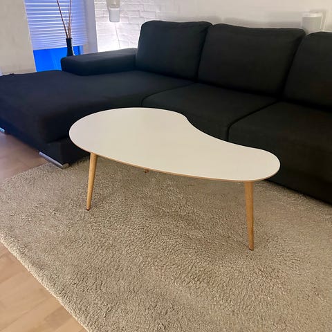 sofabord i varm eg / sort – som nyt, klistermærker er stadig på. Vendbar bordplade, kan bruges som bakke, samt er der flere måder at designe bordet til ens behov.