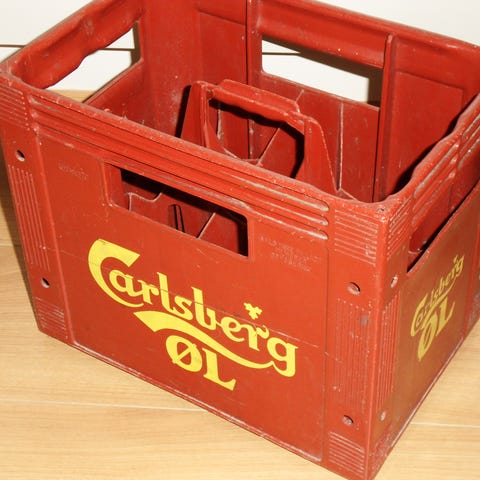 Dette er en Carlsberg OL-ølkasse, sandsynligvis en vintage 12-flaskers plastikkasse.