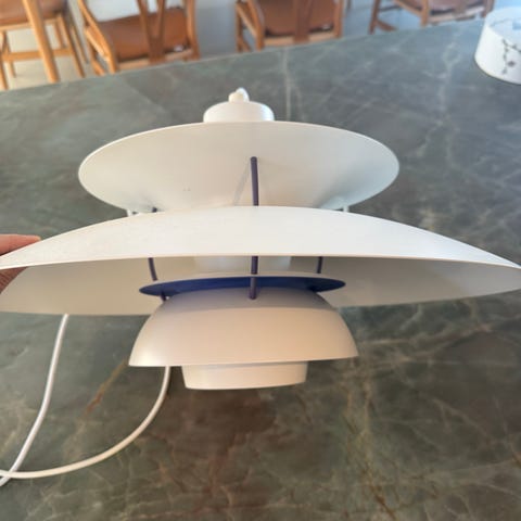 Louis Poulsen PH 5 lampe designet af Poul Henningsen. Lampen har en karakteristisk skærmopbygning med flere lag, der sikrer blændfri belysning. Lampen er hvid og har en rund form med en diameter på cirka 50 cm. Den er beregnet til ophæng i loftet og leveres med ledning til tilslutning.