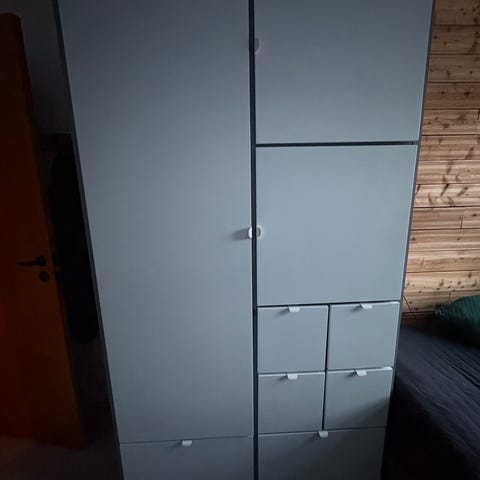 Fint garderobeskab med forskellige skuffer og skabet med hylder og garderobestang.